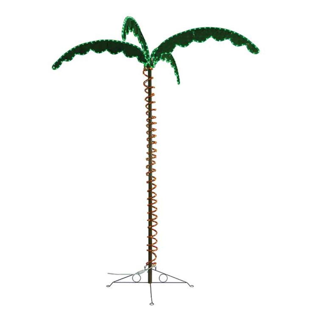 Turn any campsite, patio, or RV setting into a tropical paradise with a colorful Green Long Life Decorative 7′ LED Rope Light Palm Tree. Includes brown powder-coated metal frame and base that stably sits on any flat surface. White 5′ power cord. UL-listed for indoor or outdoor use. 120 volts, 49.92 watts. Approximately 24 LEDs per yard. Includes spare fuse.