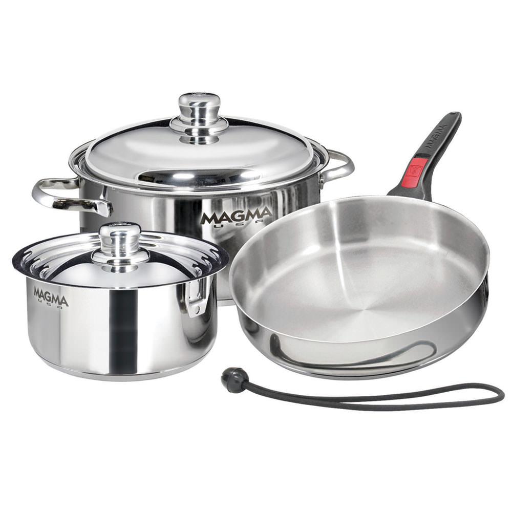 Designed specifically for use in RV’s and boats, the Magma 7-Piece “Nesting” Stainless Steel Induction Cookware Set offers professional-grade cooking that conveniently stores together in less than ½ cubic foot of cabinet space!